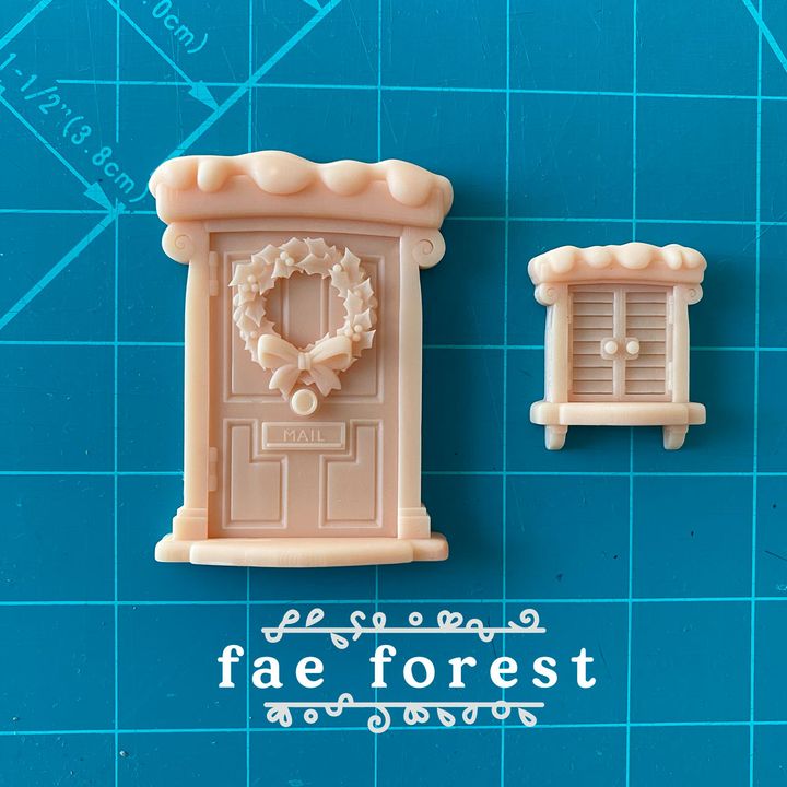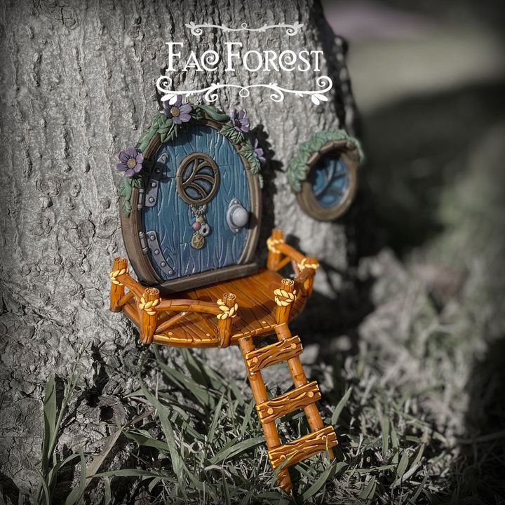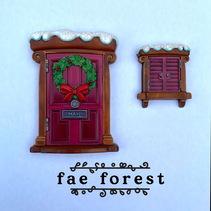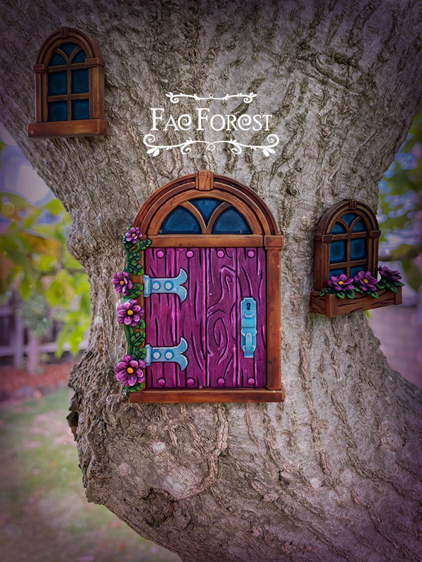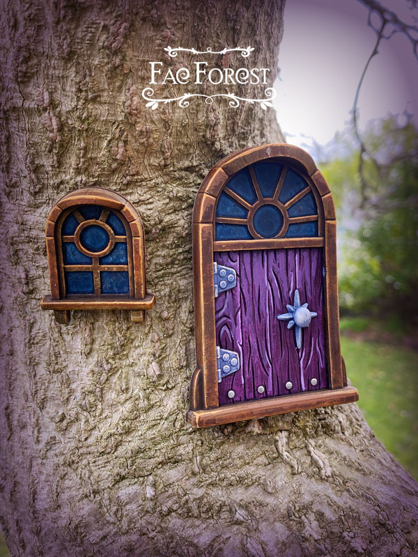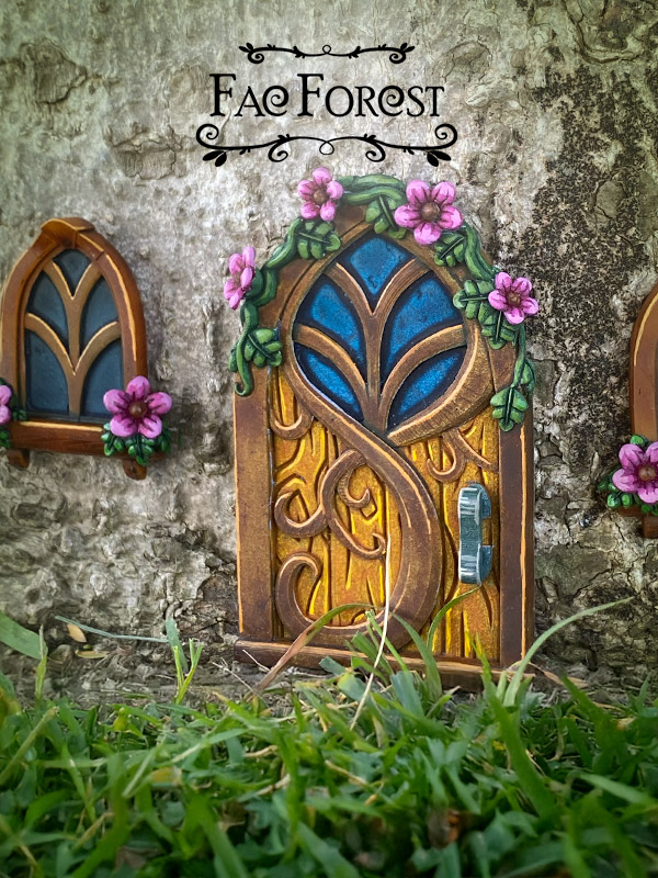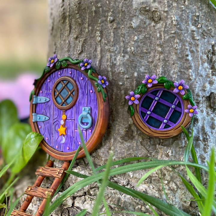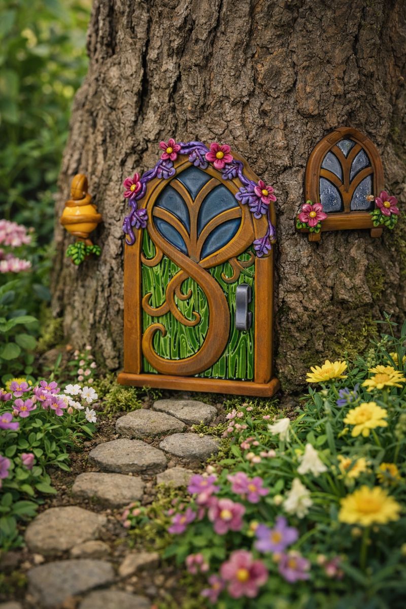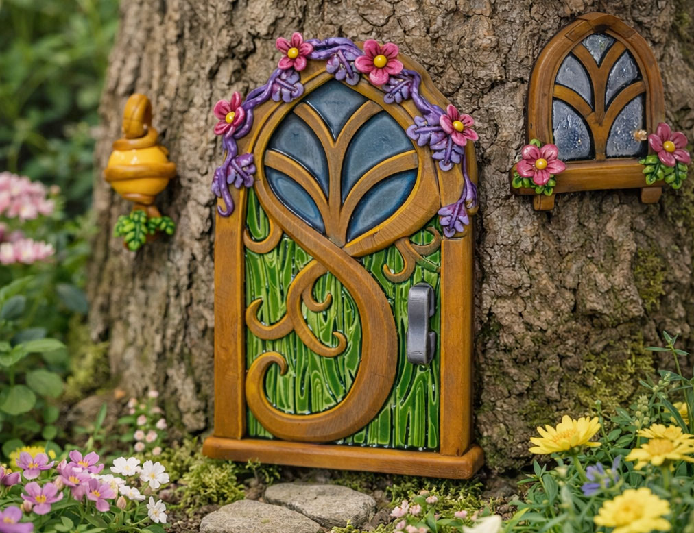 A charming woodland fairy door with matching window, adorned with delicate vines and flowers. Perfect for creating a magical entrance in your garden or at the base of a tree.